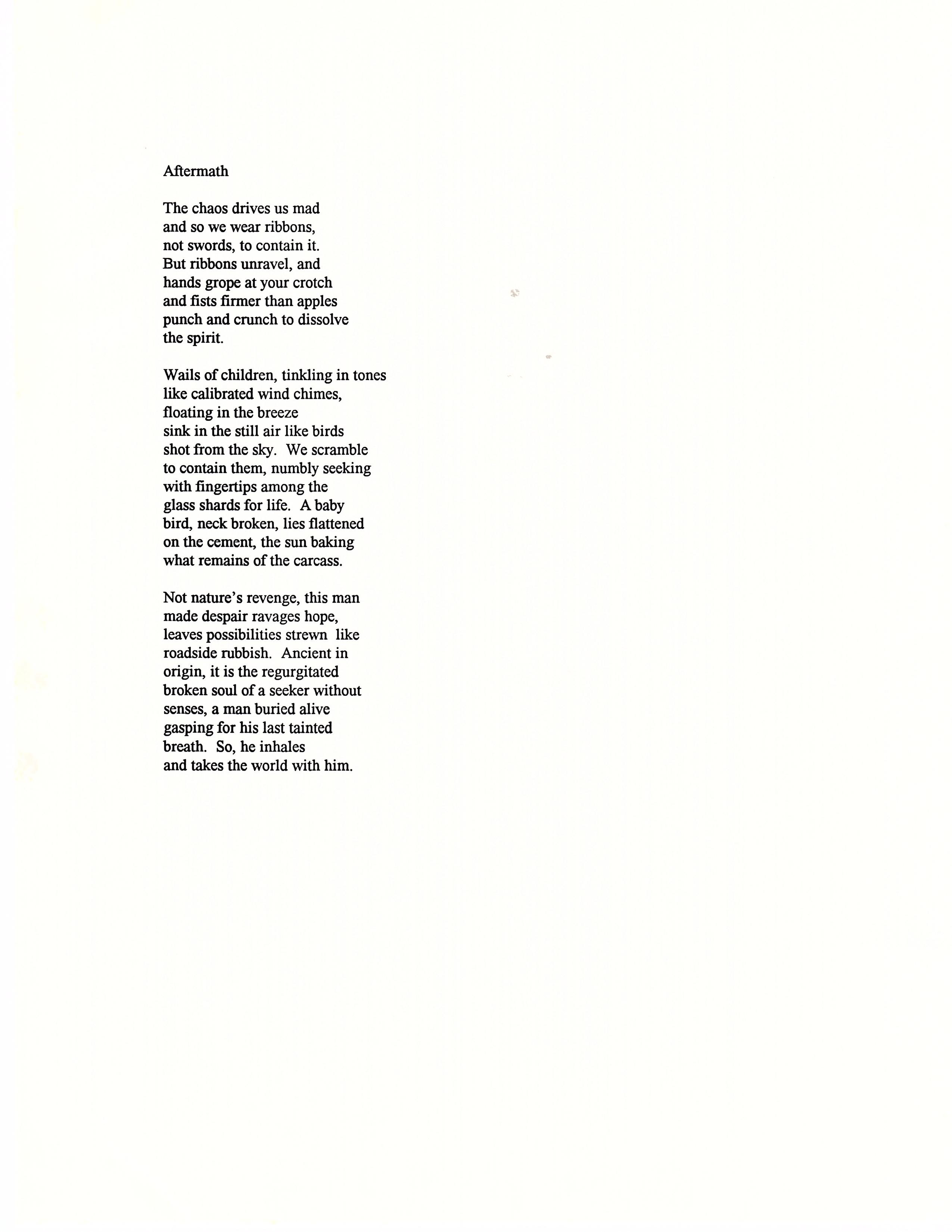 "I see an oceanscape turbulent with blues. They mottle the water like