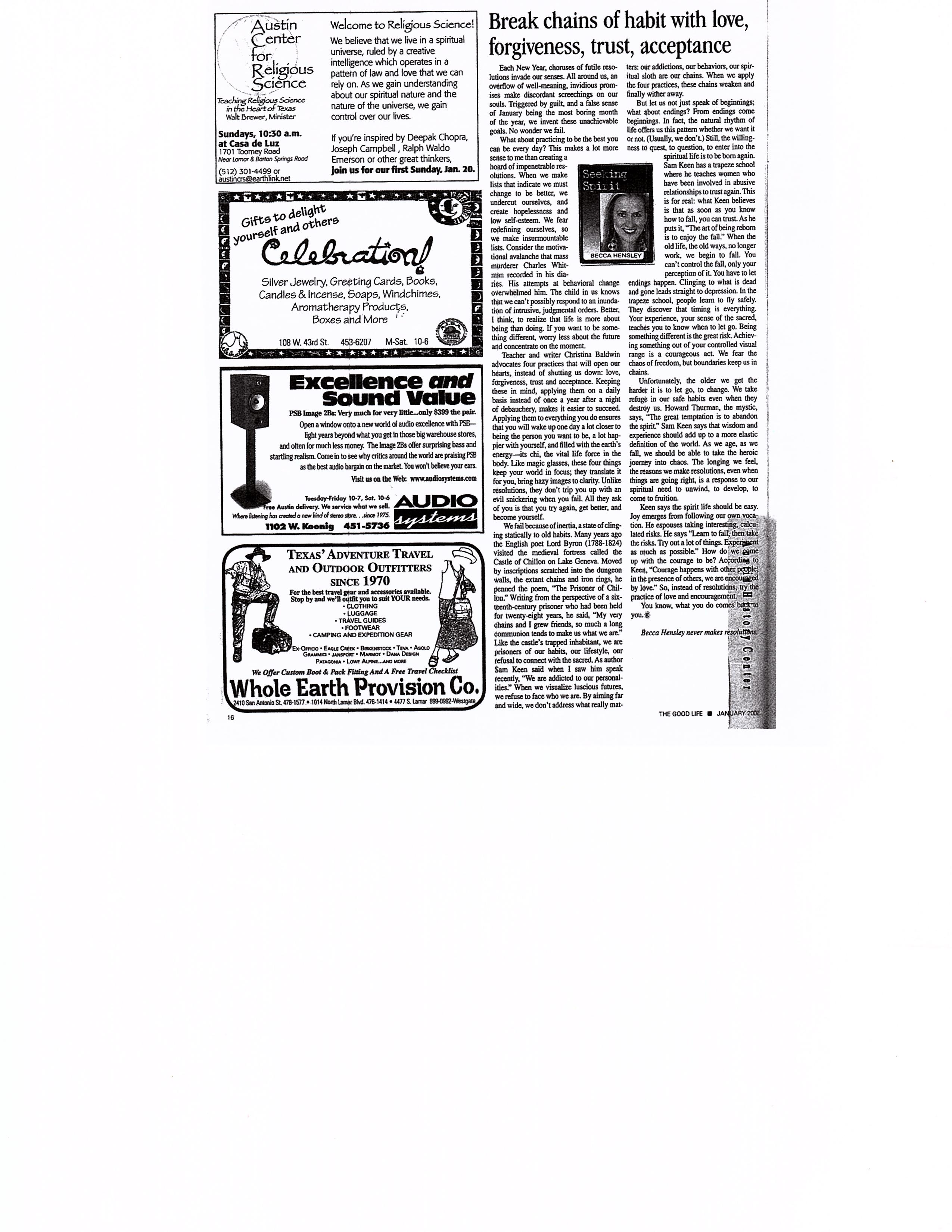 Break chains of habit with love, forgiveness, trust, acceptance…The Good Life…January 2002