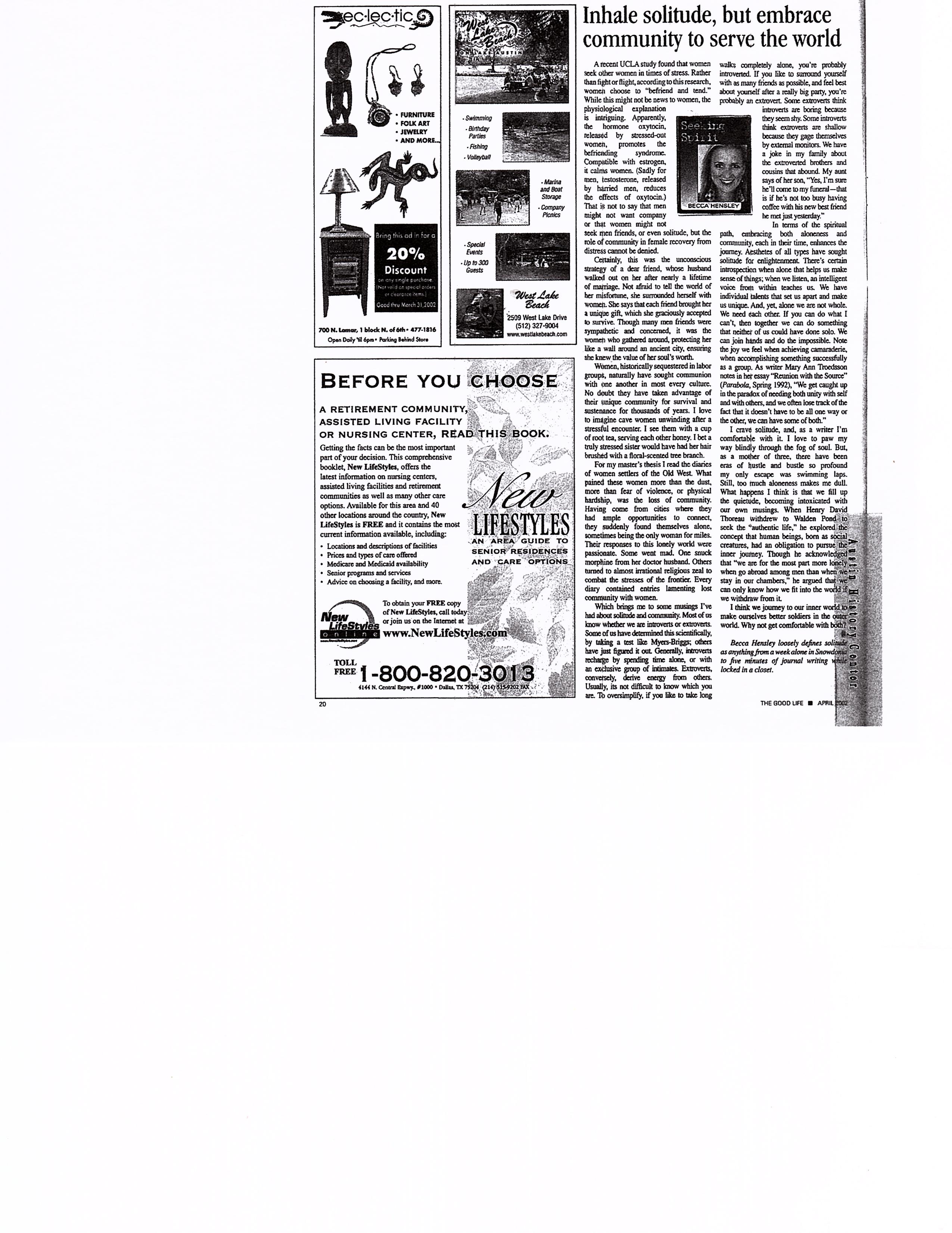 Inhale solitude, but embrace community to serve the world…The Good Life…April 2002