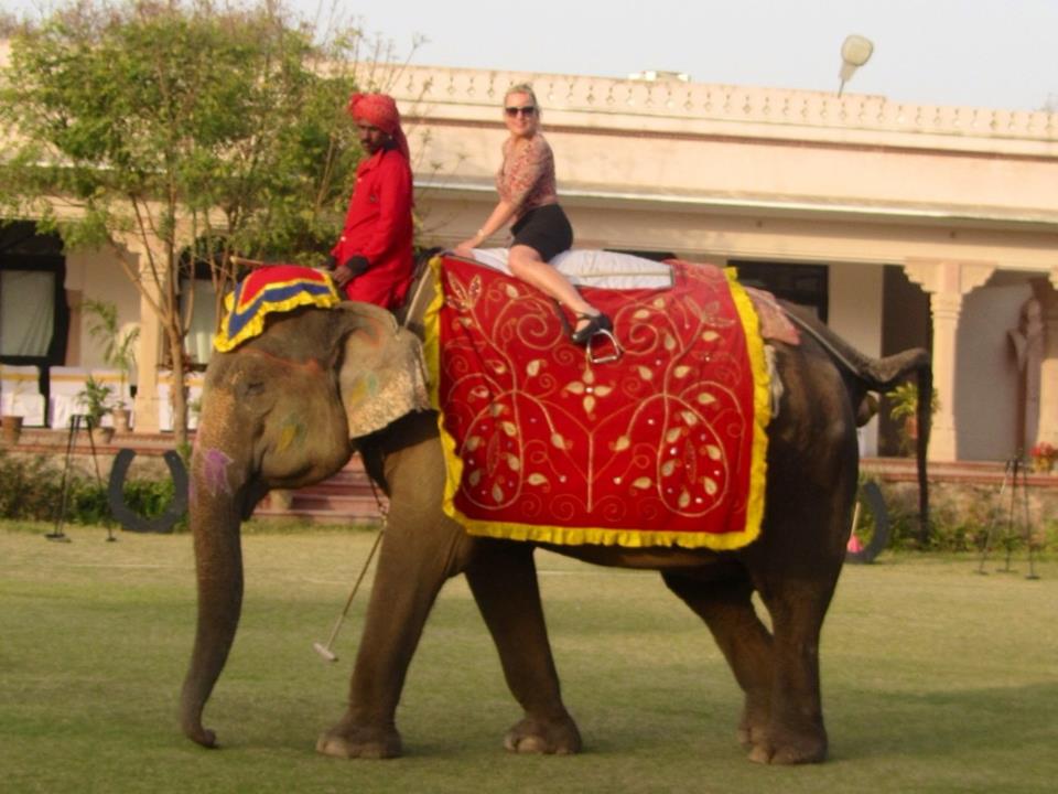 dismount the immense beast by ladder, snuggle my elephant’s crusty, swishing trunk and accept a well-deserved flute of champagne from a nattily clad waiter."