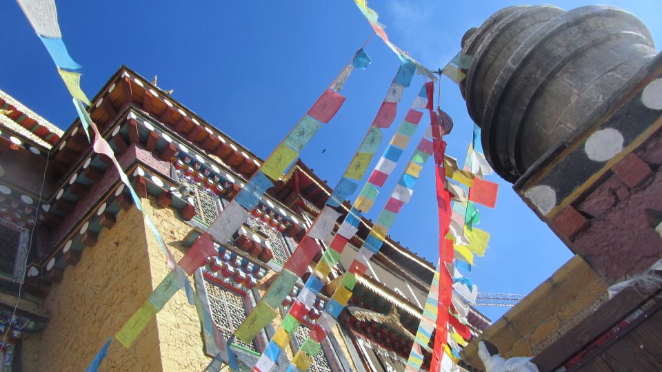 "We follow a path abundant with draped, fading prayer flags that flap in