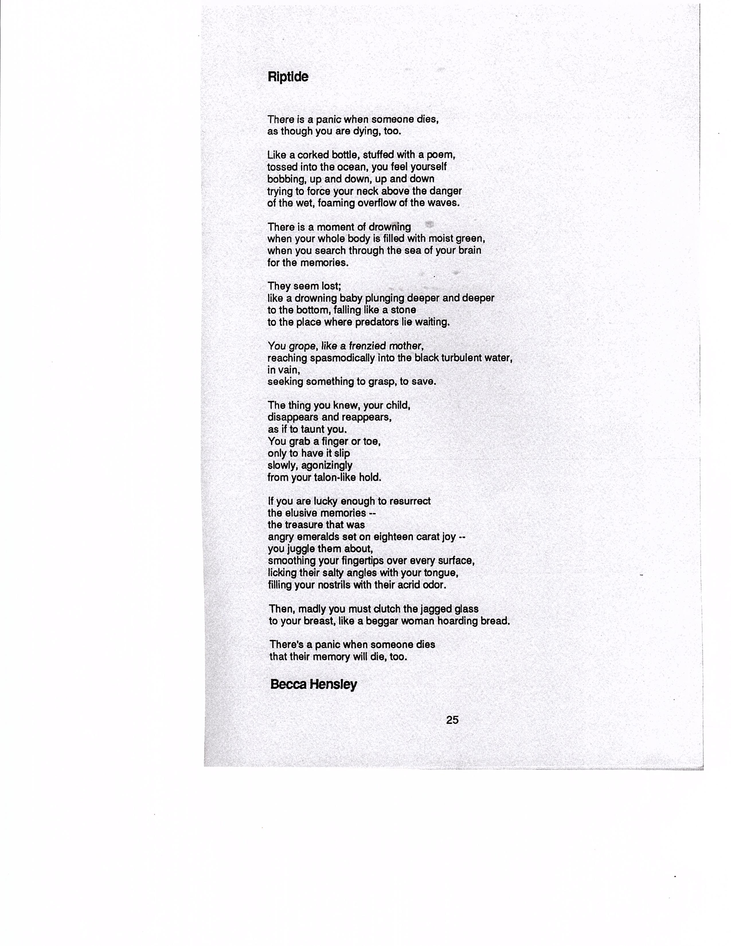 "I see an oceanscape turbulent with blues. They mottle the water like