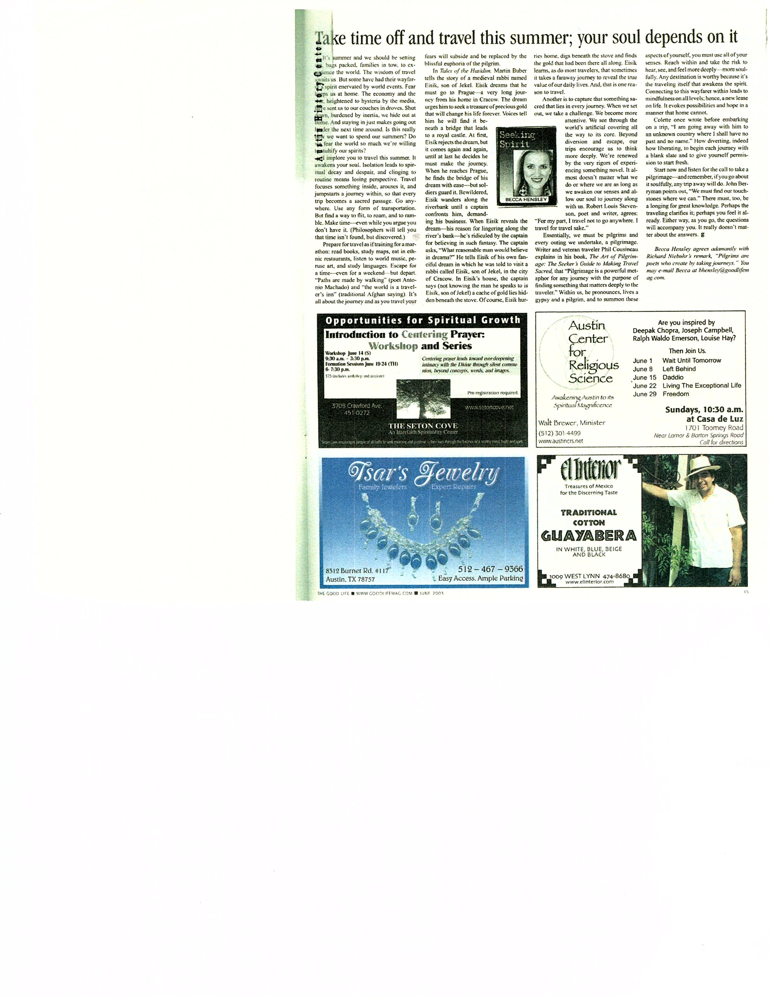 Take time off and travel this summer; your soul depends on it…The Good Life…June 2003