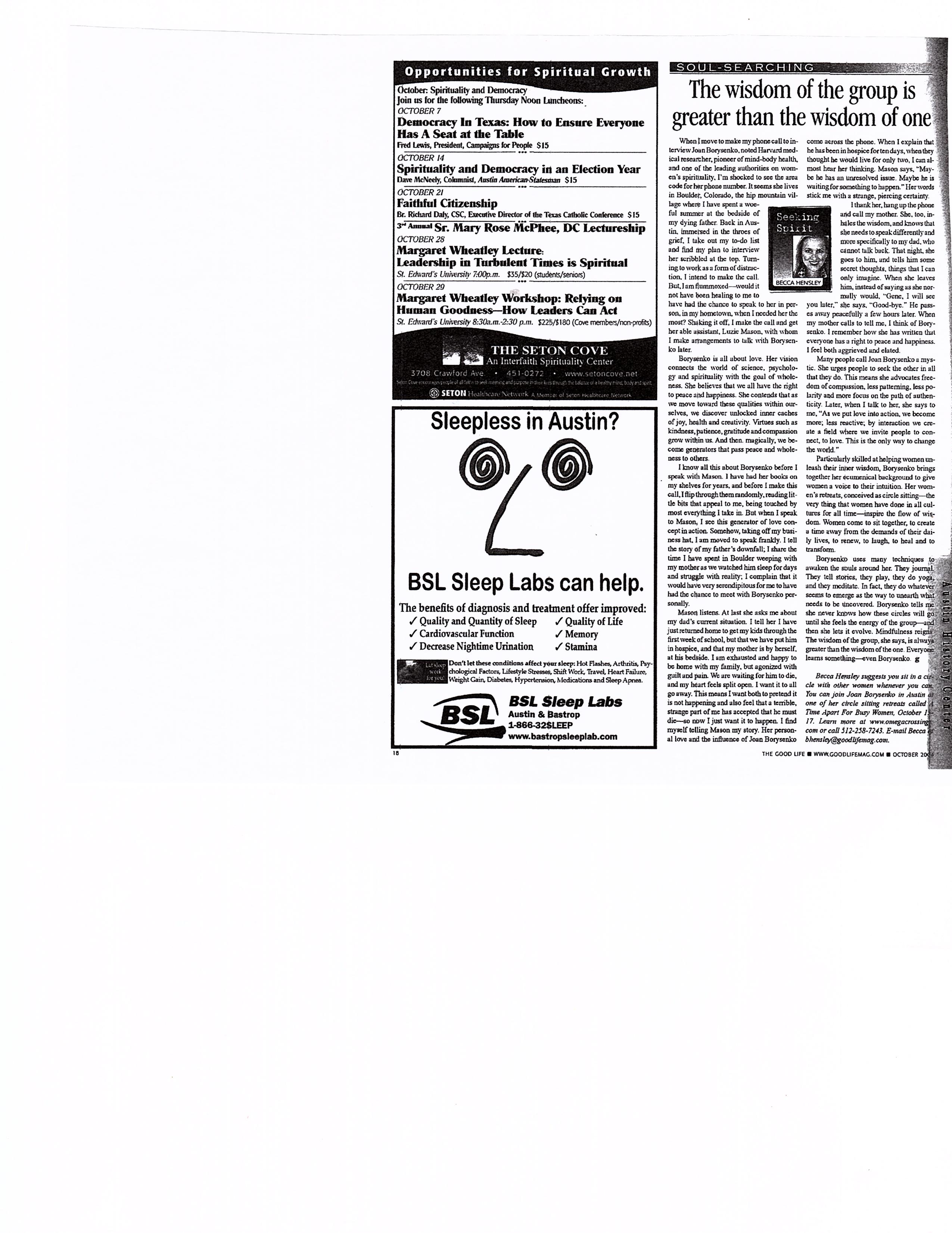 The wisdom of the group is greater than the wisdom of one…The Good Life…October 2004