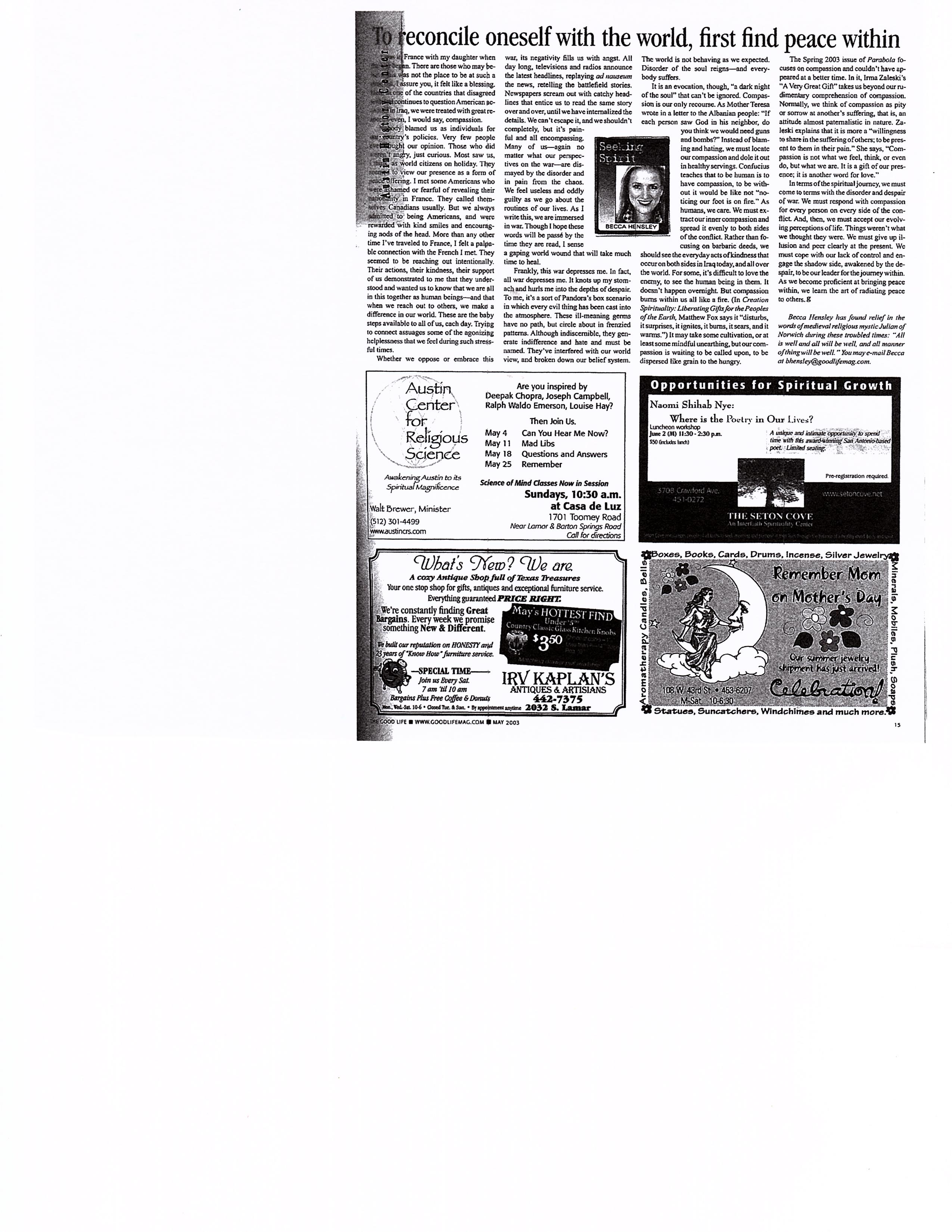 To reconcile oneself with the world, first find peace within…The Good Life…May 2003
