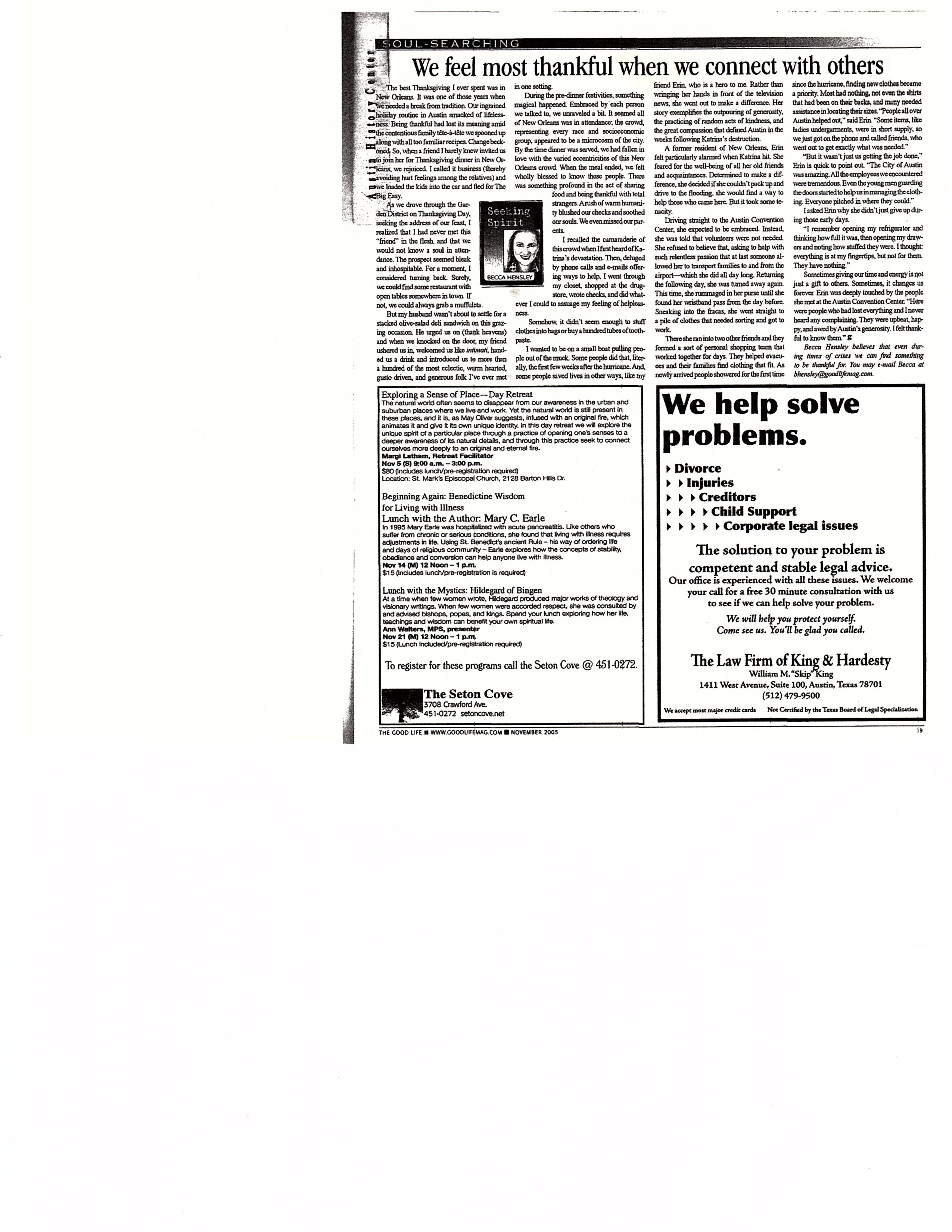 We feel most thankful when we connect with others…The Good Life…November 2008